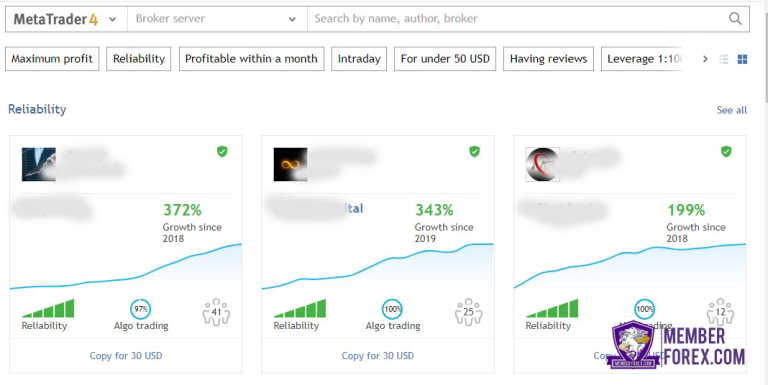 Gambar di atas adalah rank teratas dari penyedia sinyal yang bagus, bisa dilihat dari pertumbuhan akunnya dan reliability yang berwarna hijau.